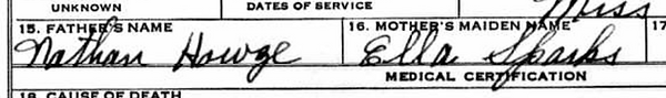 Alcorn's sister Mary died in 1950. Her death certificate lists her parent's names as Nathan Howze and Ella Sparks--same first names, different last names.