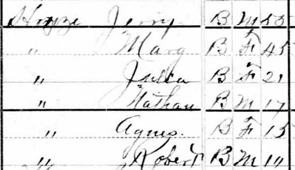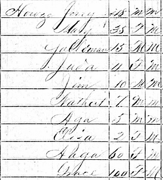 I believe Aga was Jerry's mother, and Grace his grandmother. If that was true, then these would be Nathan's mother and grandmother as well. I wondered if I could find anything about them before 1870--which is hard to do when researching Black family history, because most Black folks were not listed by name in earlier census records or "slave schedules" as they are called.